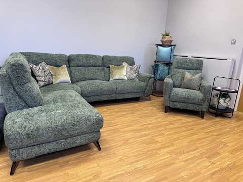 Contempo Left facing Electric reclining corner sofa & matching reclining chair in green chenille basket weave fabric